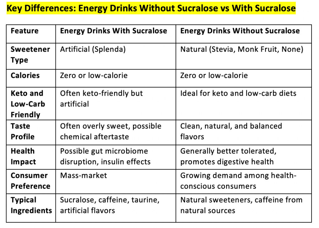 Using natural sweeteners absent from sucralose results in a finer and cleaner taste, as there is an absence of strong chemical aftertaste. This results in numerous energy drinks tasting far better.